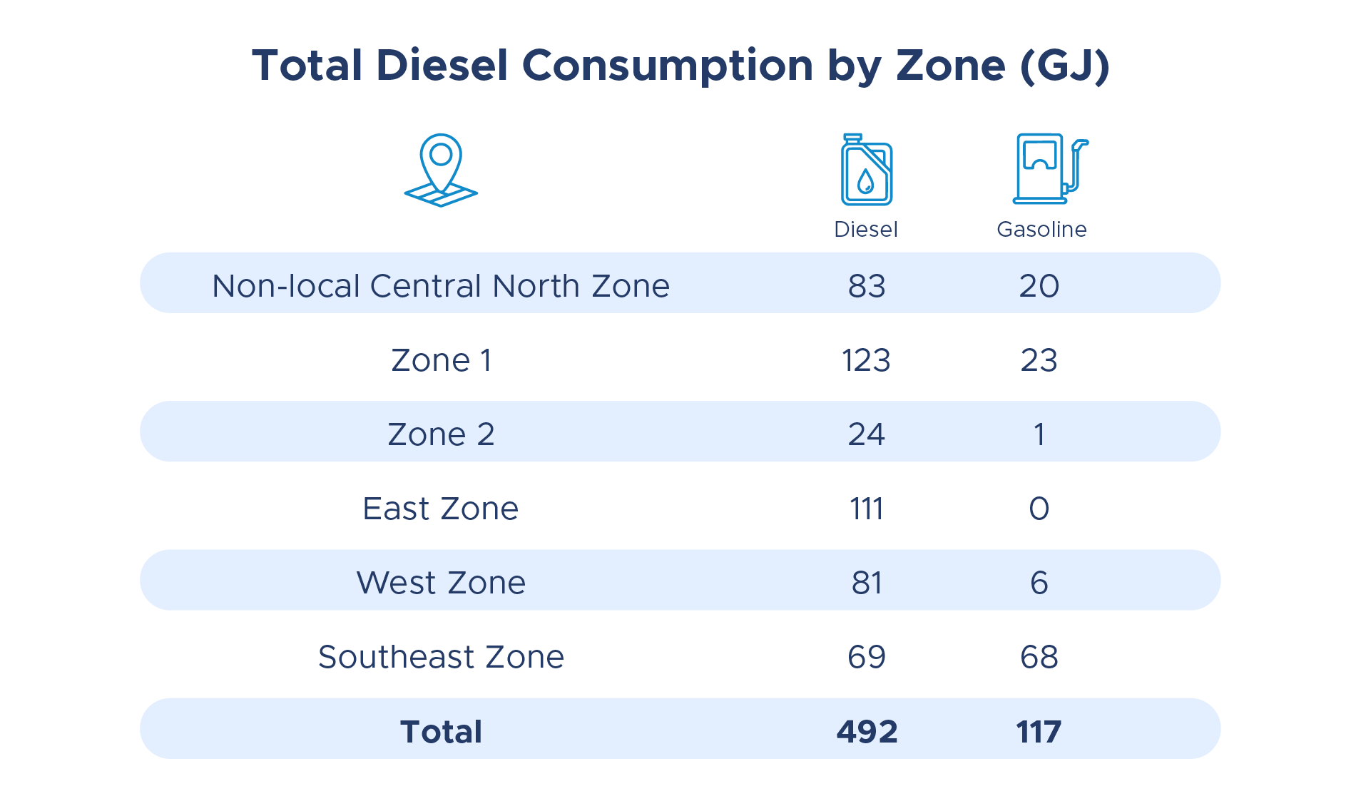 At FRISA, we recognize the importance of implementing measures to reduce our consumption of natural resources and minimize our associated carbon footprint. As part of our firm commitment to sustainability, we have placed special emphasis on improving energy efficiency. In 2024, the Company recorded a total diesel and gasoline consumption of 492 GJ and 117 GJ, respectively, and below we provide detailed information regarding our use of this resource during the period.