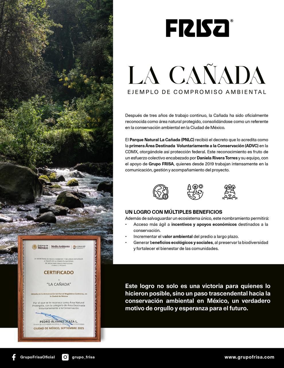En el año 2019, Grupo FRISA inició la ejecución del proyecto denominado "Parque Natural La Cañada" (PNLC) con el propósito de transformarlo en un entorno natural destinado a la educación ambiental, el fortalecimiento de la comunidad y la promoción de la vida social en el centro de la Alcaldía Magdalena Contreras. Este proyecto contempla la incorporación de áreas comerciales y espacios públicos, así como lugares de encuentro y la promoción de actividades ecoturísticas para preservar la diversidad biológica que el bosque y el río aportan.